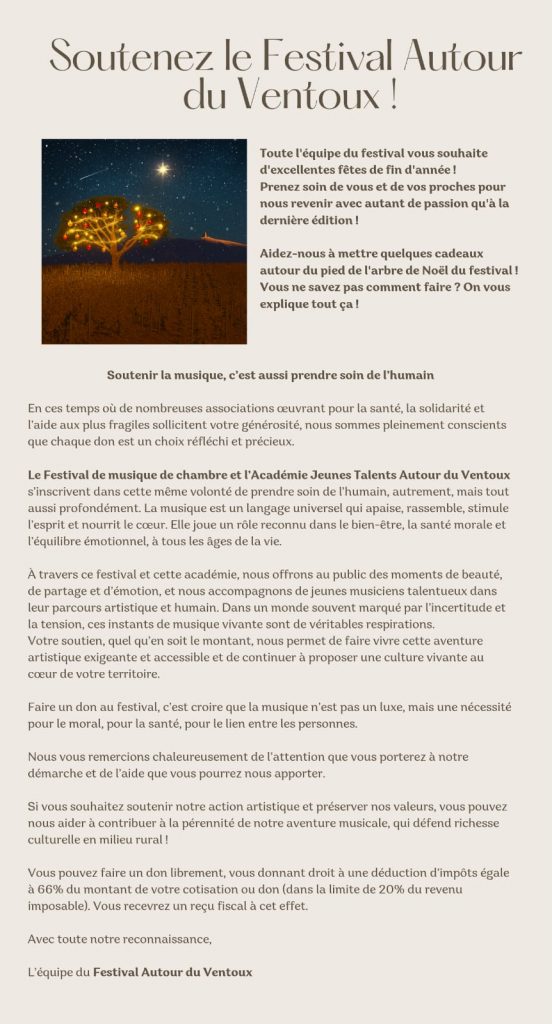Par chèque à l’ordre d’Autour du Ventoux à renvoyer à l’adresse suivante : Association Autour du Ventoux, 728 route du hameau de Veaux 84340 Malaucène